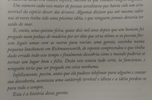 Apesar do tom diferente da história, continua sendo uma leitura boa e divertida. É quase impossível se decepcionar num enredo quando o próprio escritor se coloca em pé de igualdade com seus personagens: “Havia um motivo para contar esta história, mas, temporariamente, fugiu da mente do autor”.